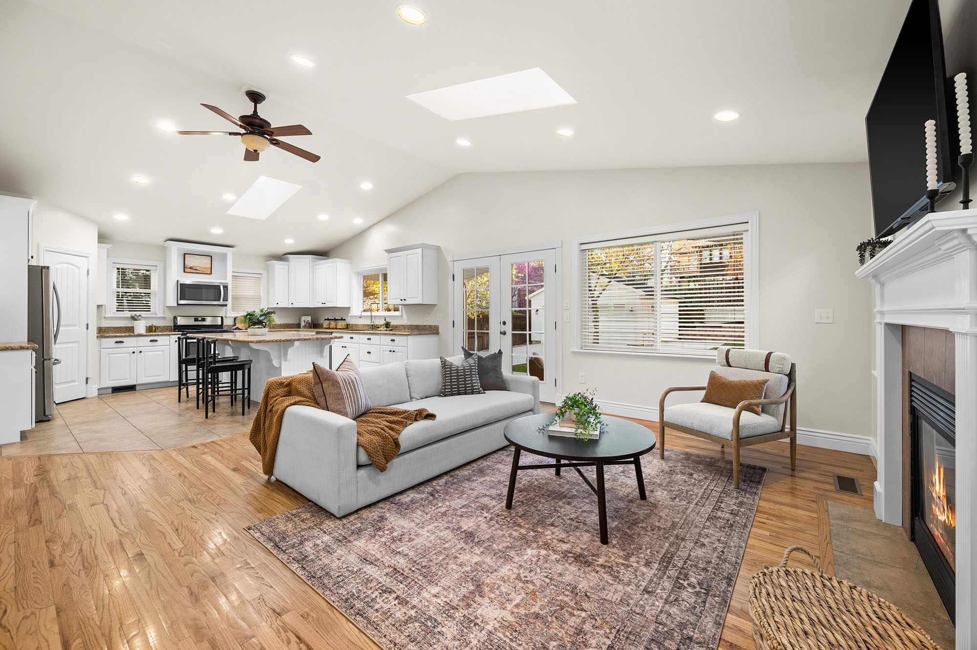 Inside, timeless architectural charm is seamlessly paired with elevated modern design. A grand, light-filled kitchen with vaulted ceilings anchors the home and flows effortlessly into inviting living spaces designed for both refined entertaining and comfortable everyday living.