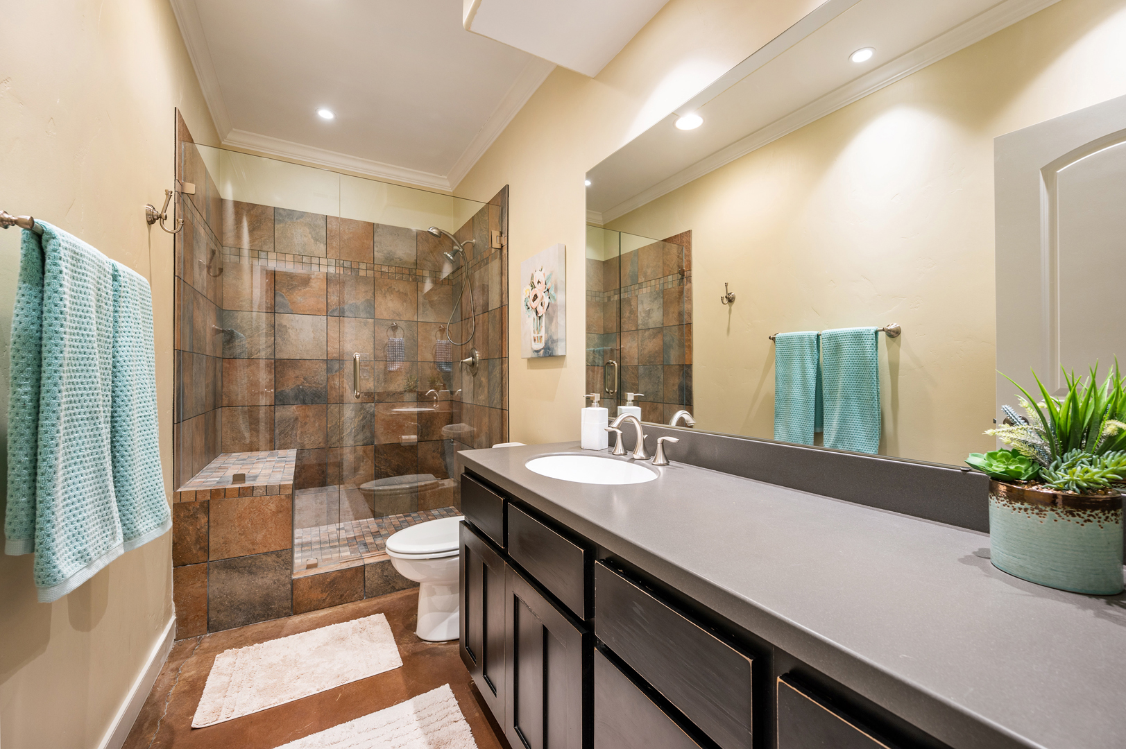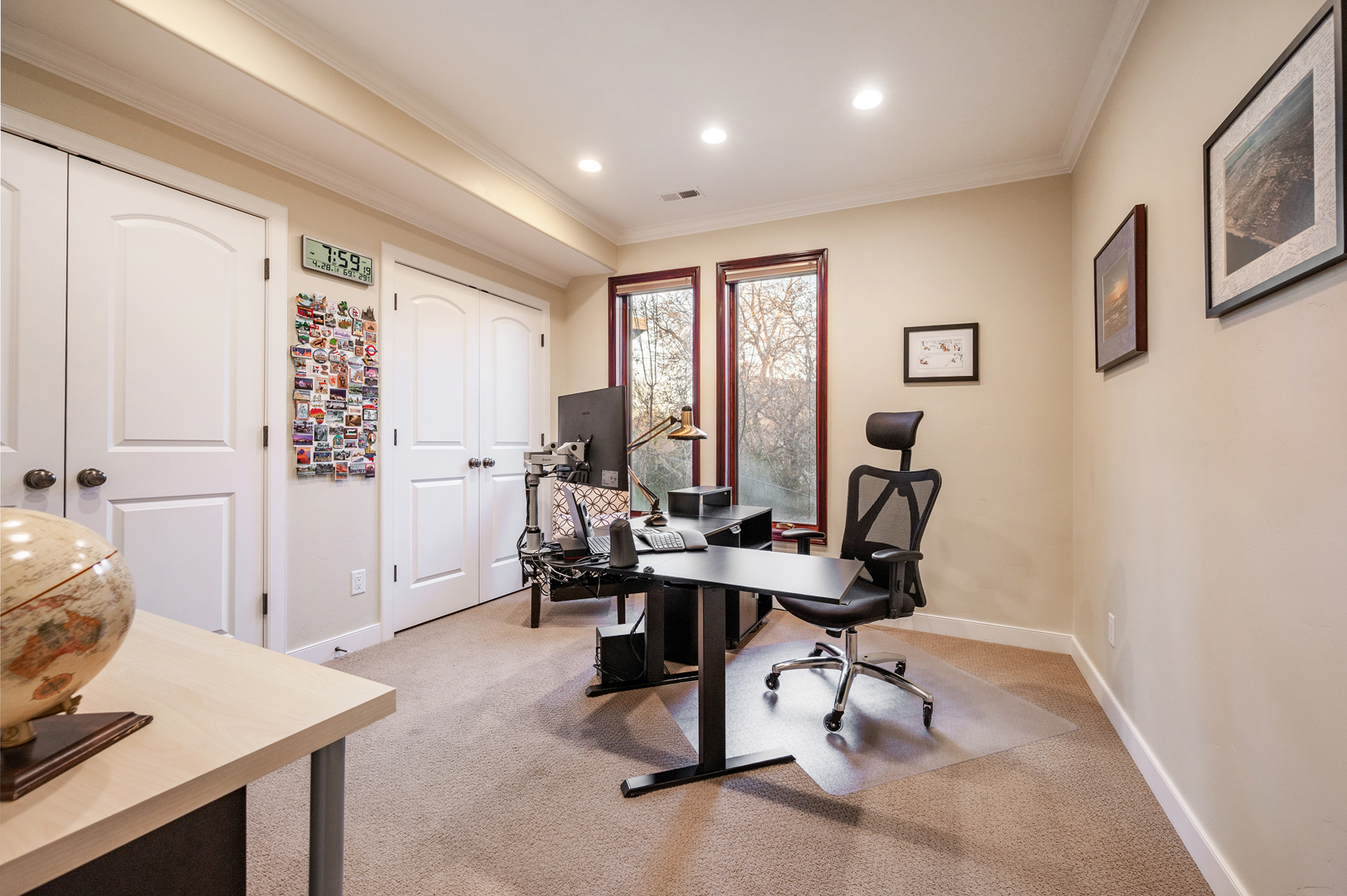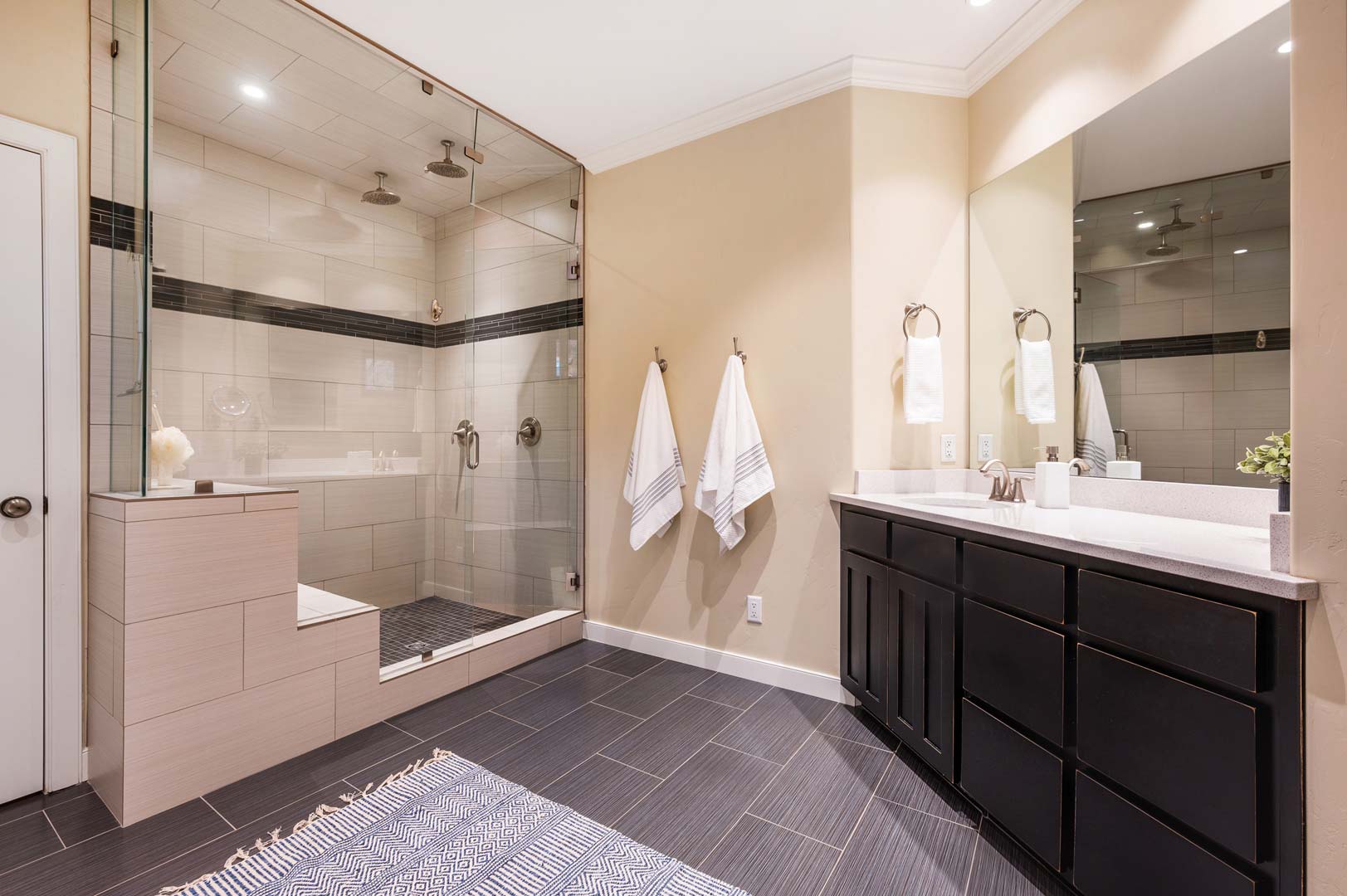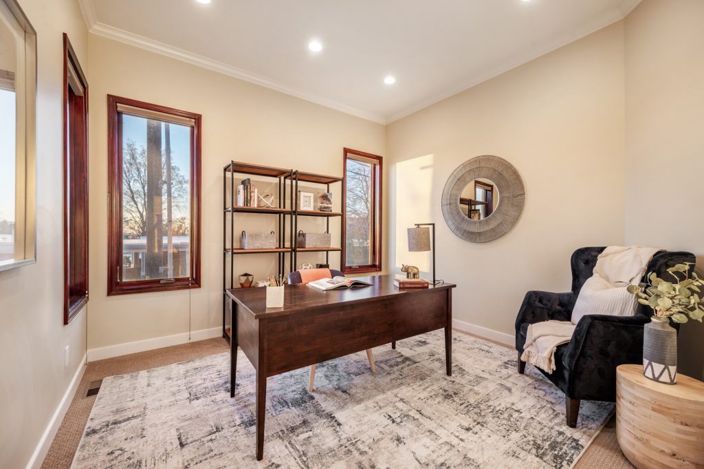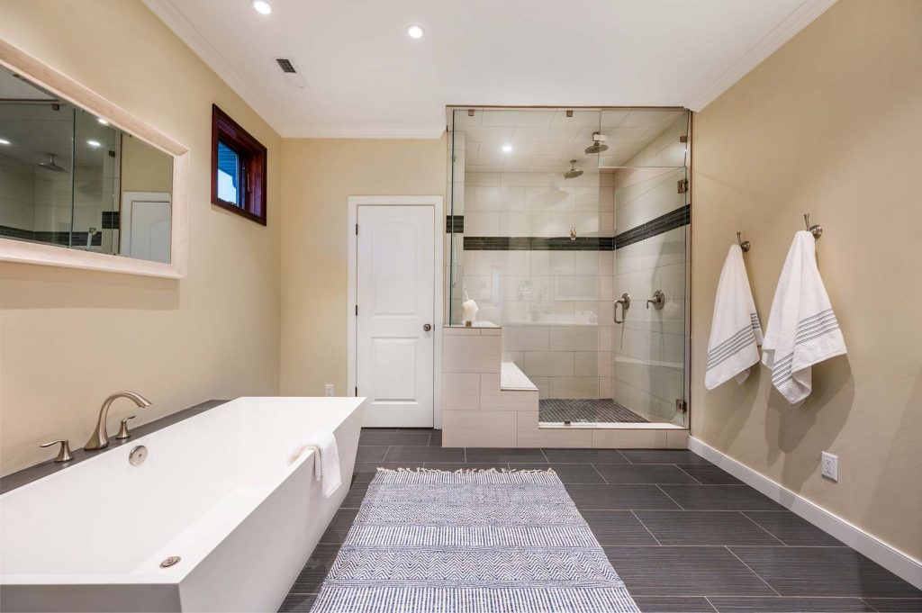 Each of the 3.5 bathrooms boasts high-end elements, including eye-catching tiling in two of the showers. One of the four bedrooms includes double closets, providing ample storage. The primary suite includes a spa-like ensuite equipped with a large enclosed steam shower (double shower heads), separate soaking tub, and water closet.