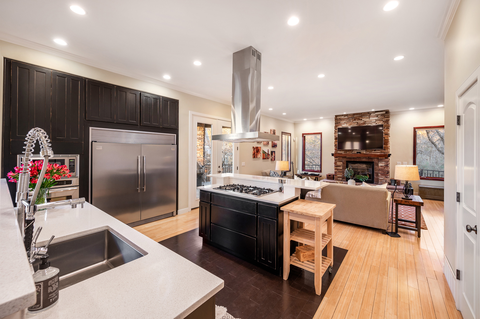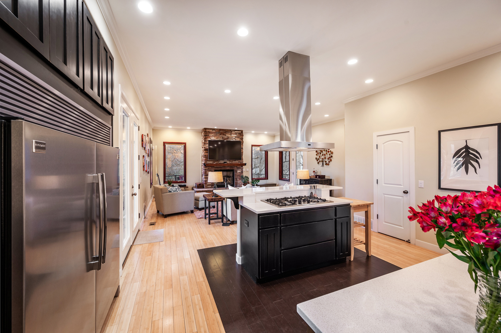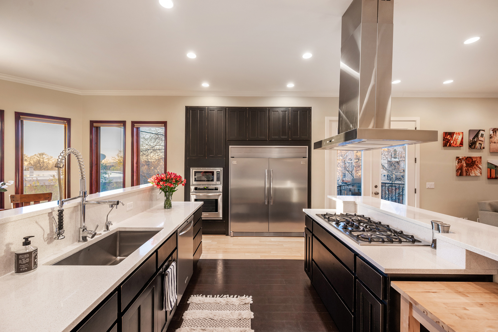The modern kitchen includes rich, dark cabinetry and a commercial-grade refrigerator. Pull up a stool to the raised bar to enjoy a quick breakfast before heading out the door. This room also features a large pantry with plenty of room for storage and a gourmet gas cooktop with a powerful vent hood mounted above it. A wet bar in the basement has similar dark cabinetry complemented by gray countertops and a wine refrigerator.