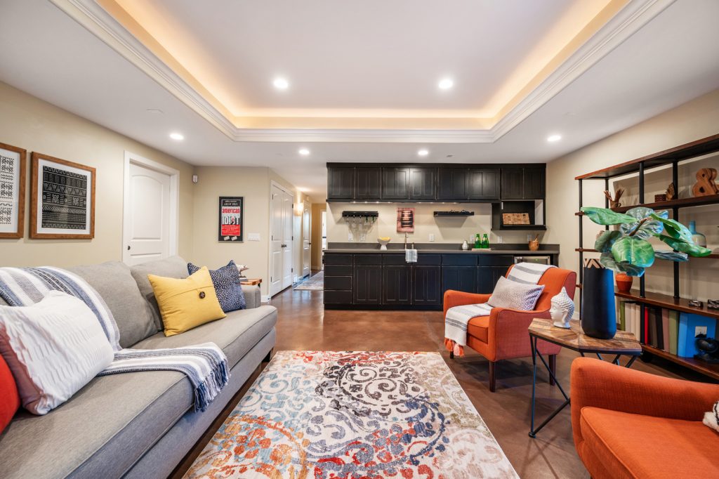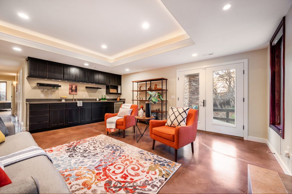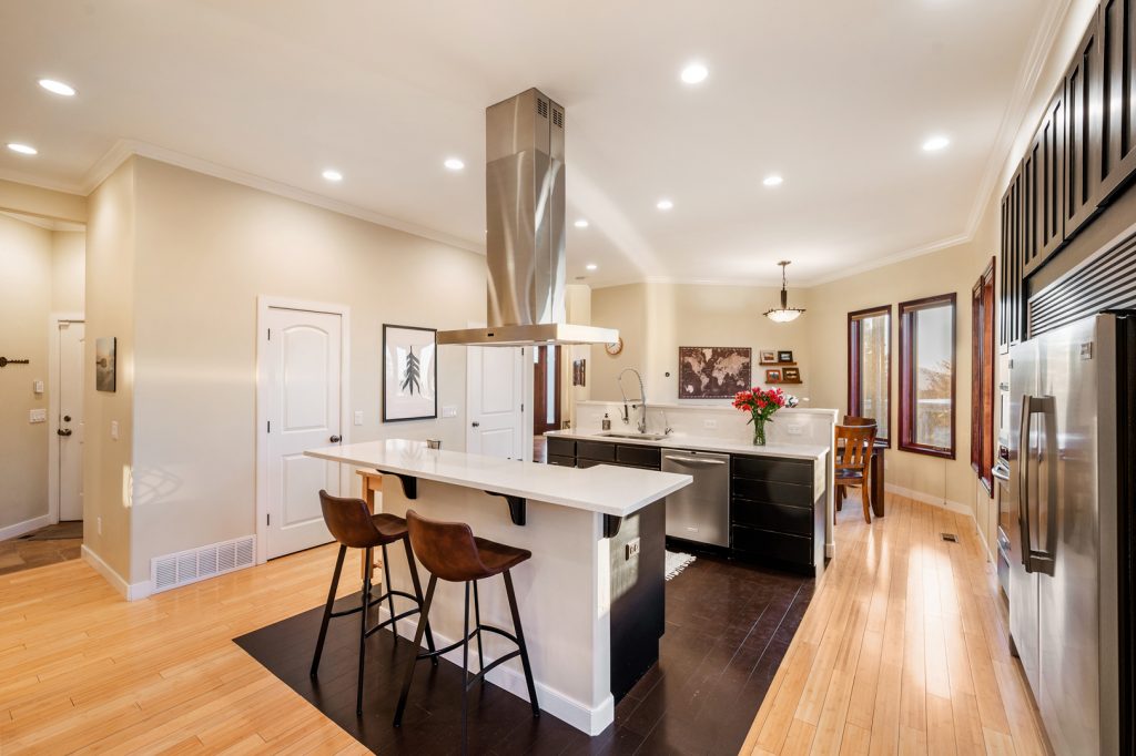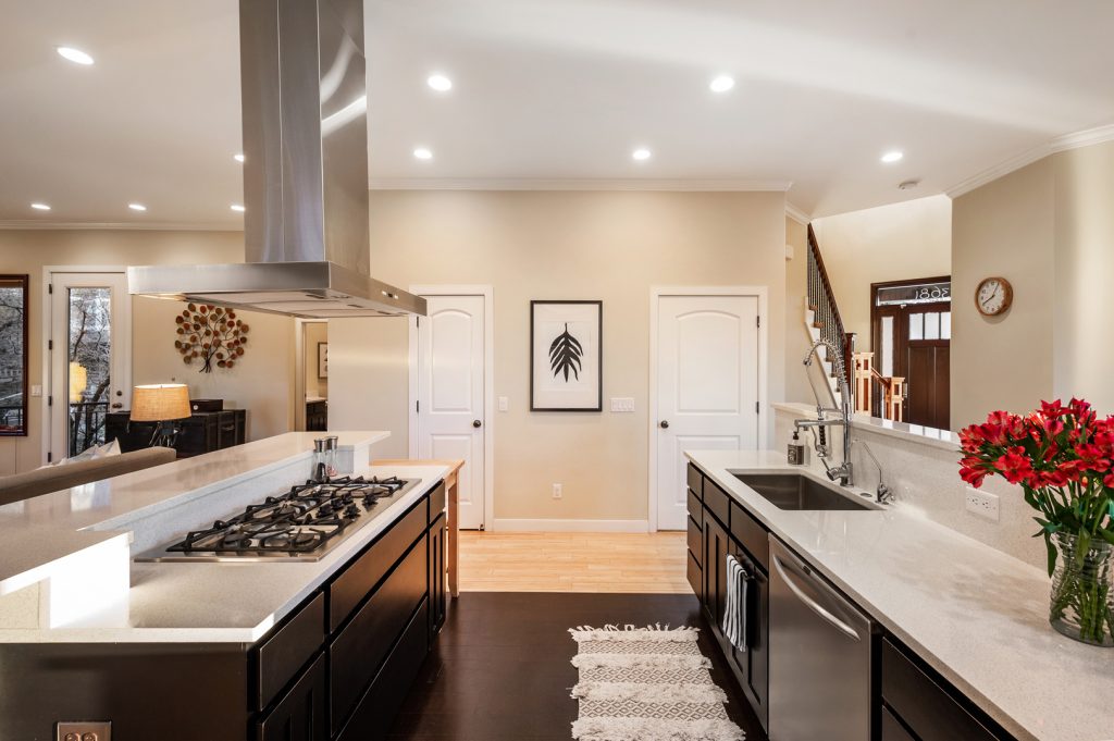 The modern kitchen includes rich, dark cabinetry and a commercial-grade refrigerator. Pull up a stool to the raised bar to enjoy a quick breakfast before heading out the door. This room also features a large pantry with plenty of room for storage and a gourmet gas cooktop with a powerful vent hood mounted above it. A wet bar in the basement has similar dark cabinetry complemented by gray countertops and a wine refrigerator.