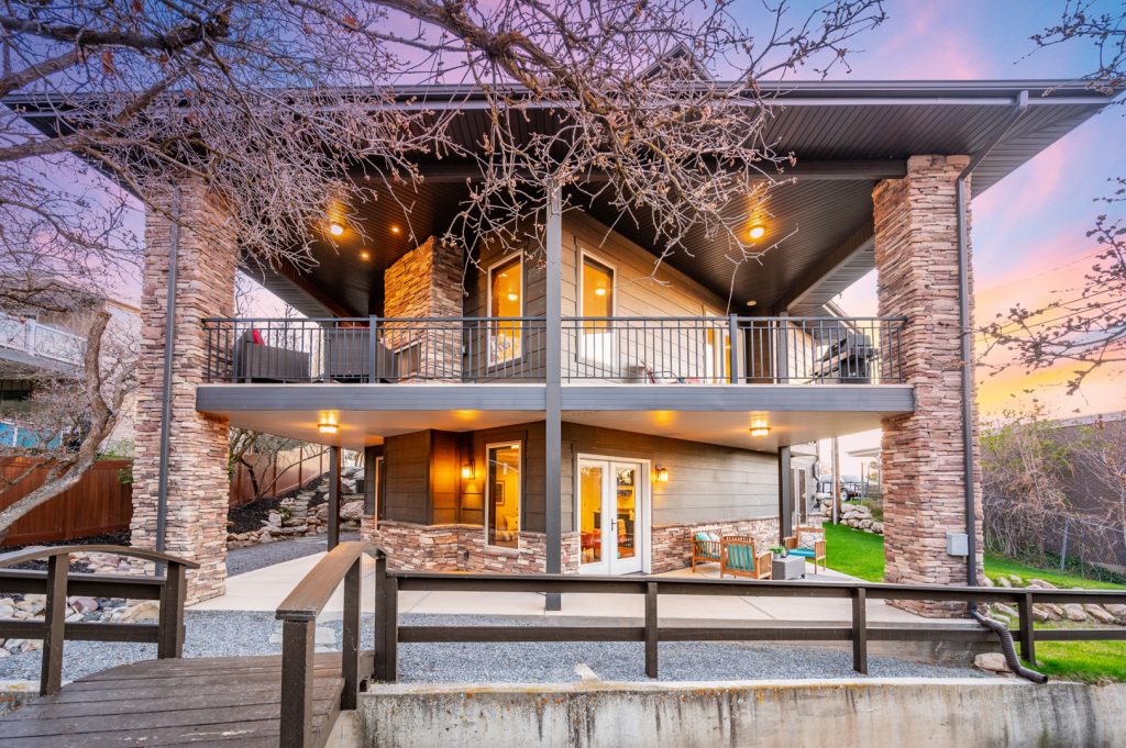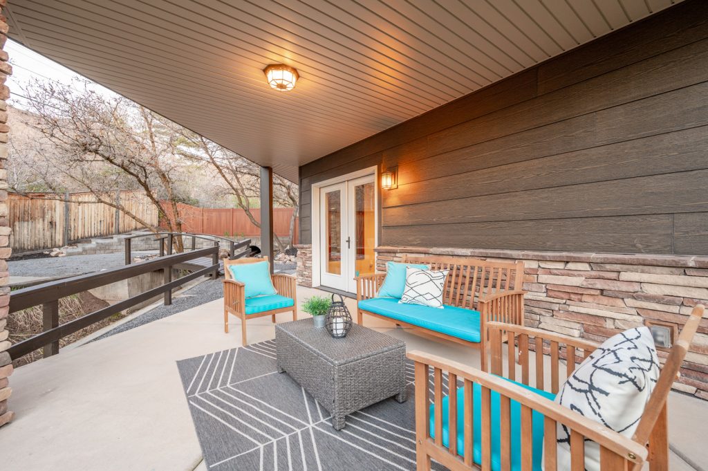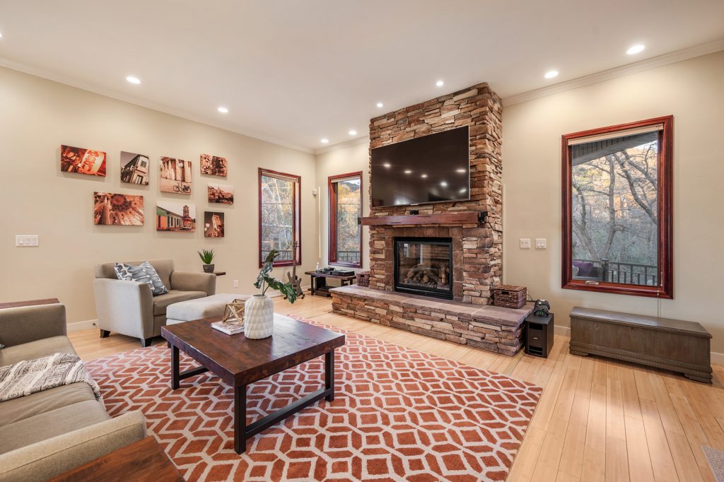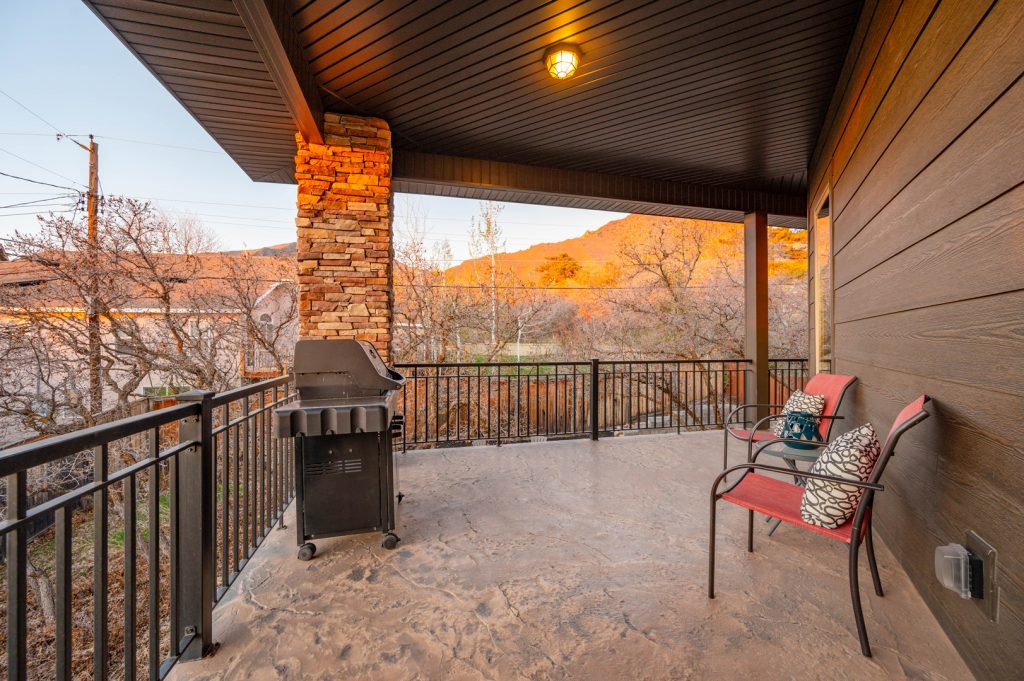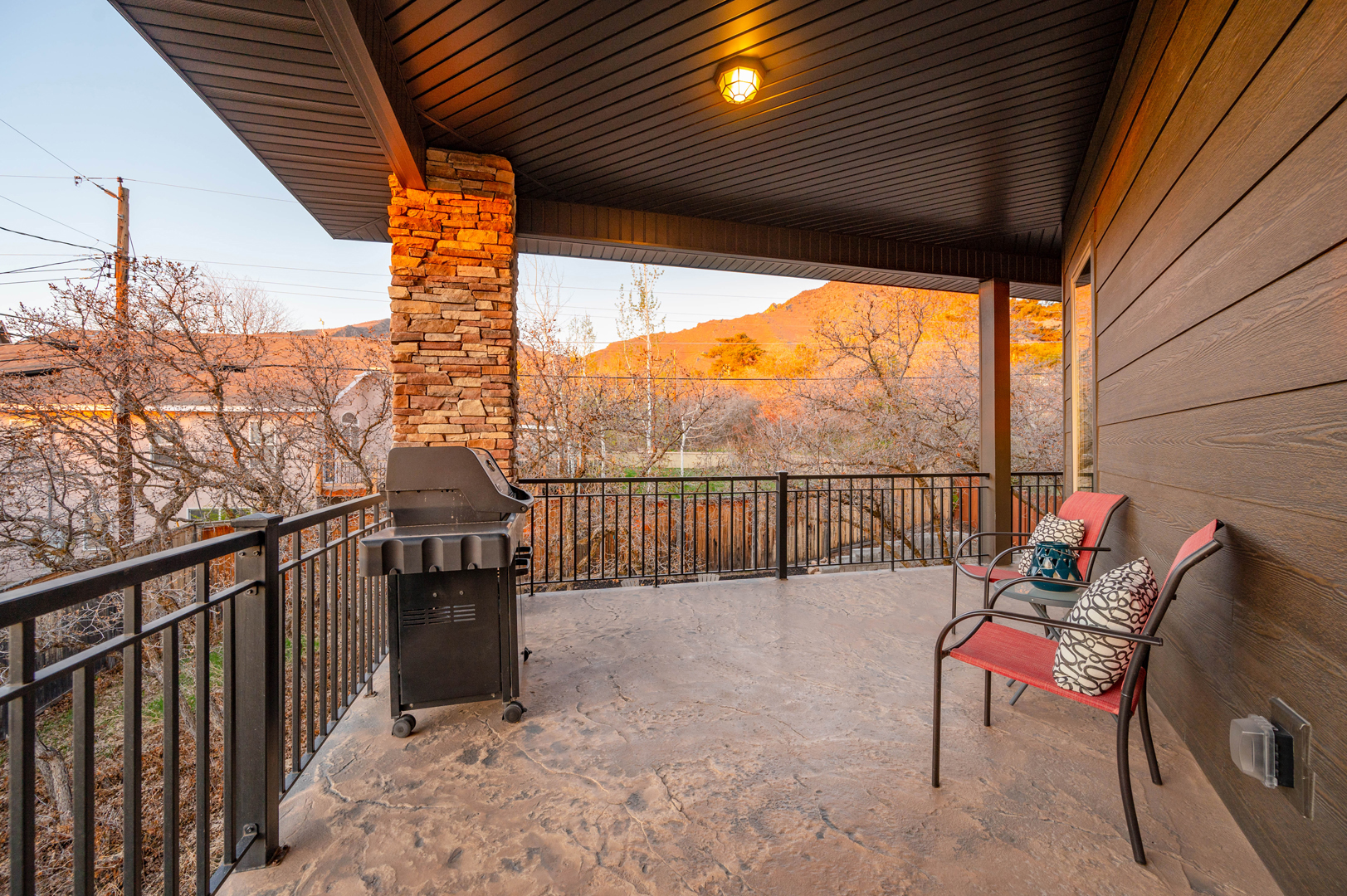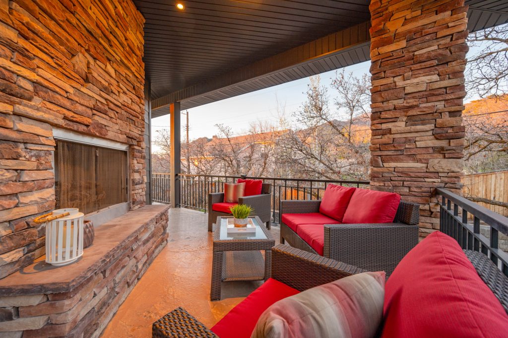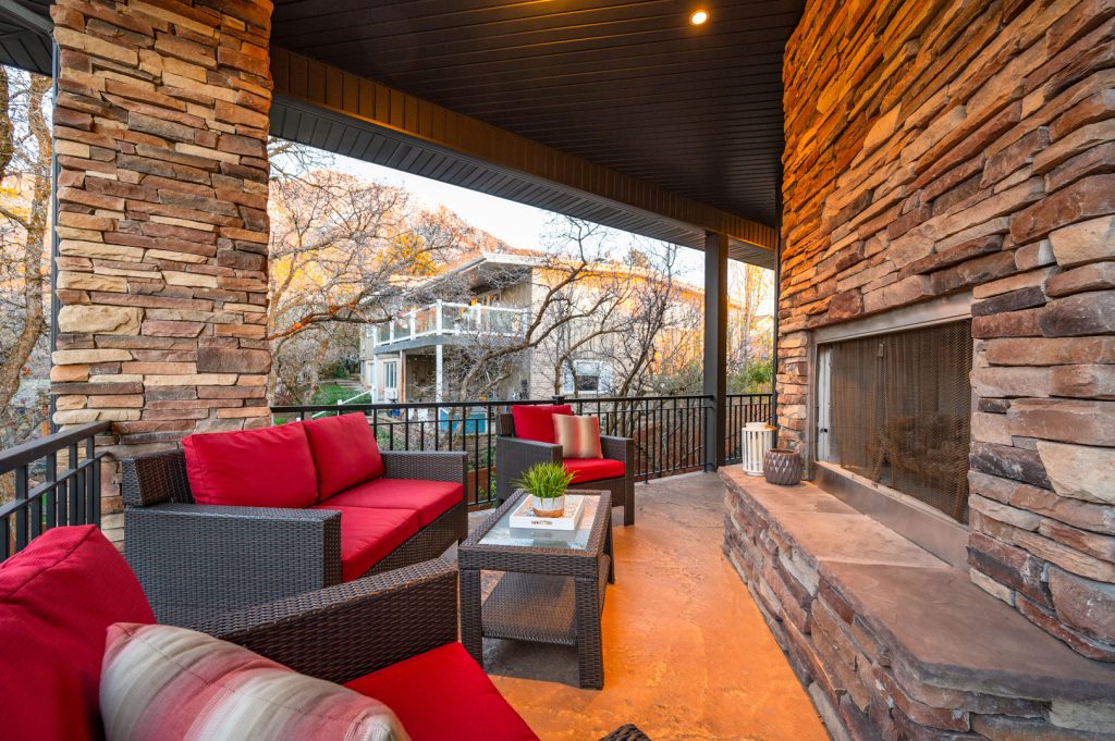An inviting outdoor fireplace on the covered outdoor living space provides the perfect location for chatting around the flames and enjoying the mountain views. The exterior of this home is sure to impress with its brick accents and wood-inspired siding.