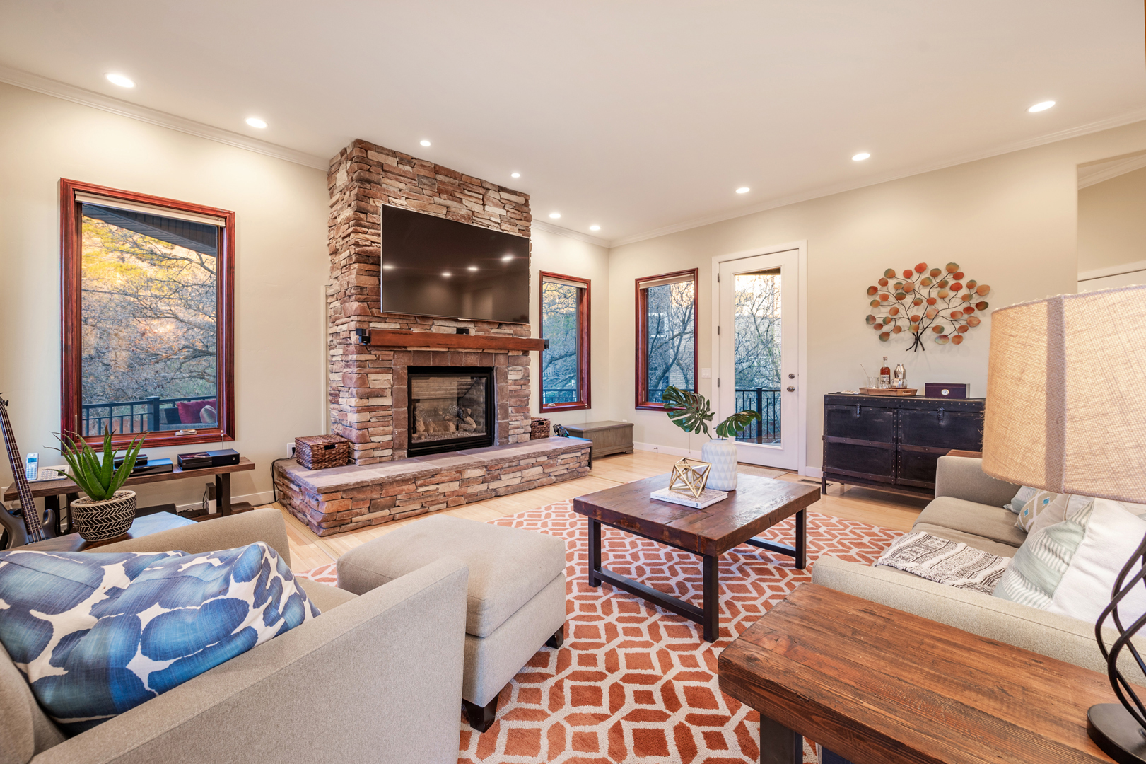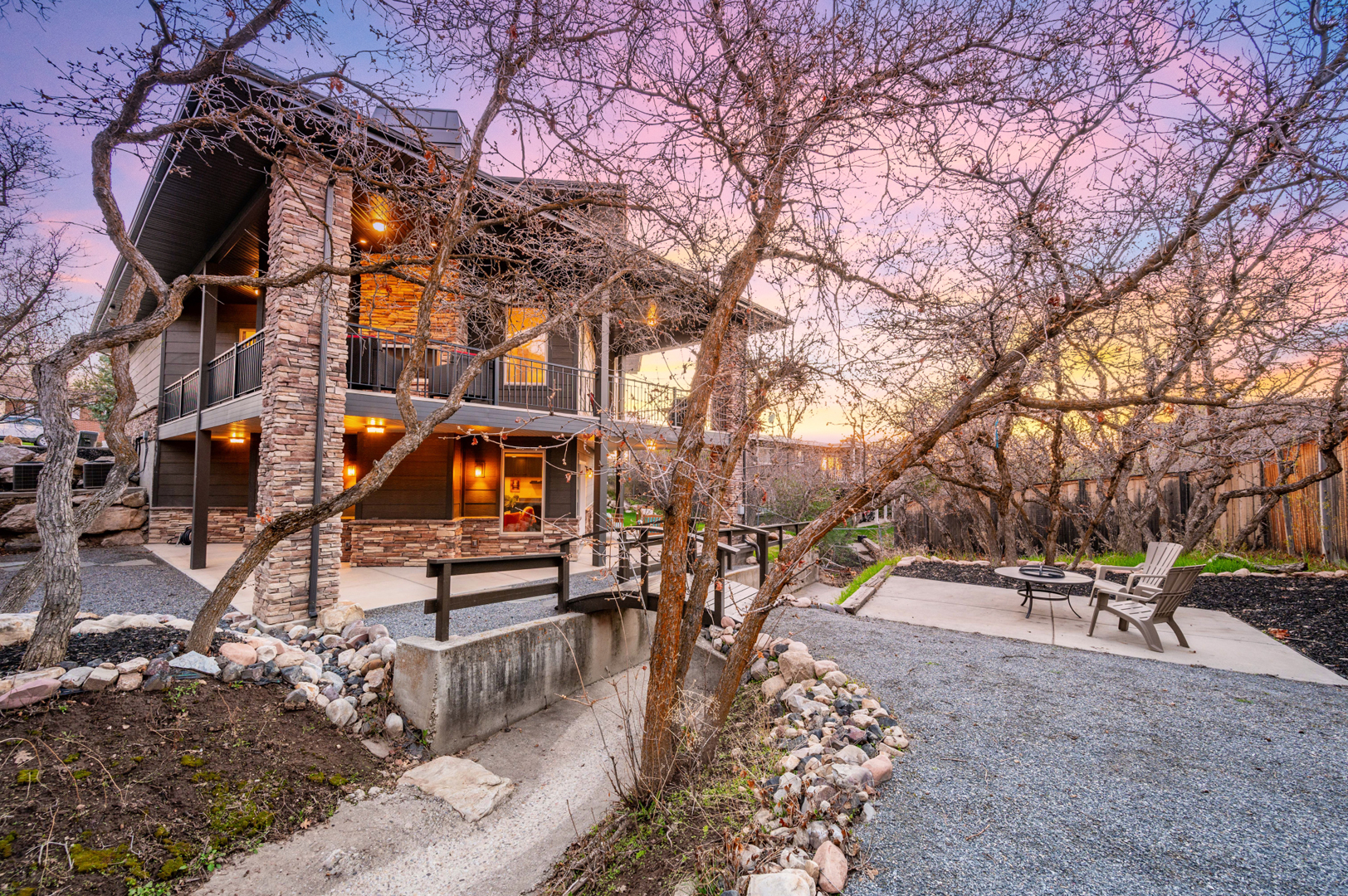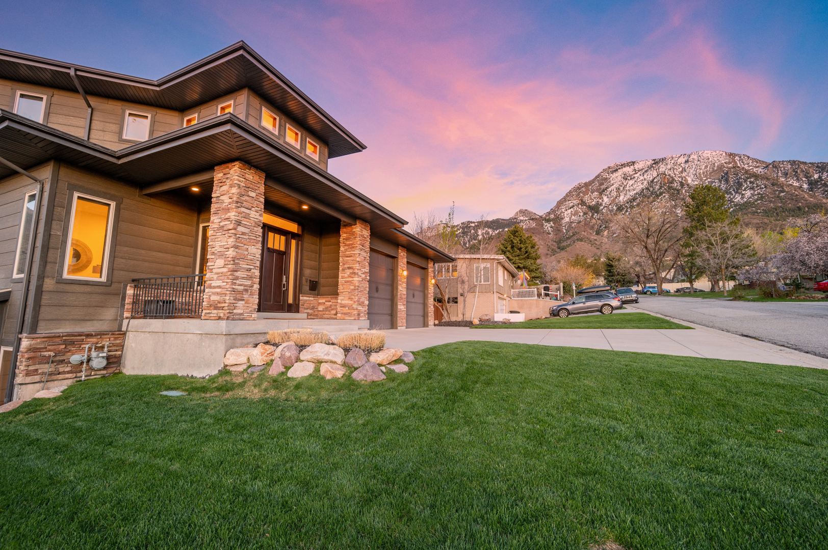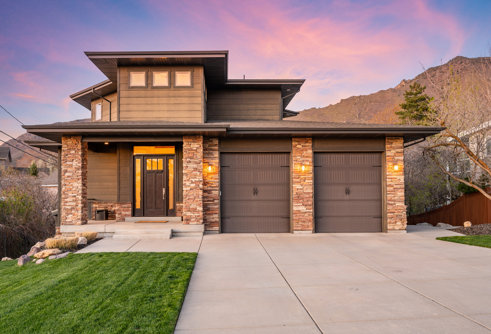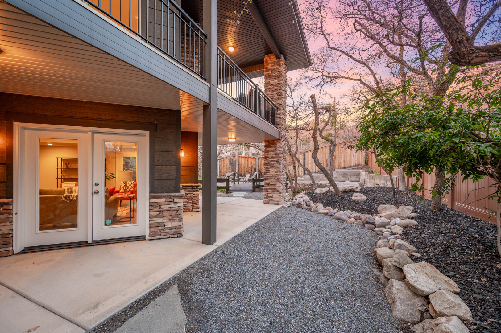 An inviting outdoor fireplace on the covered outdoor living space provides the perfect location for chatting around the flames and enjoying the mountain views. The exterior of this home is sure to impress with its brick accents and wood-inspired siding.